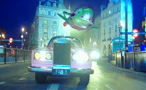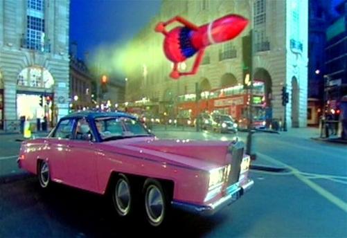 A full size FAB 1 pink Rolls Royce glides through Picadilly Circus, as Thunderbird 3 zooms overhead ...